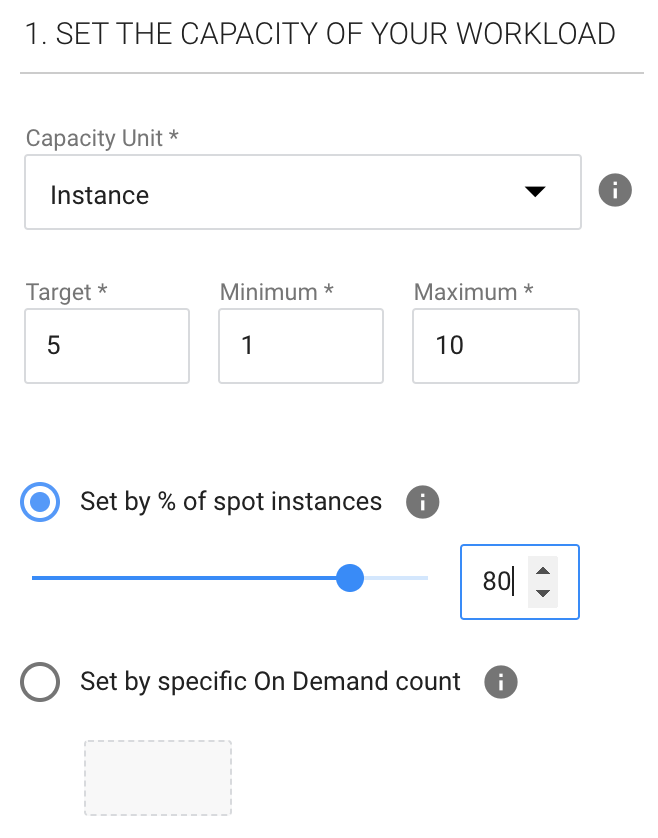 • Set by % of spot instances: Percent of total instances that should be spot instances. The rest will be on-demand instances.