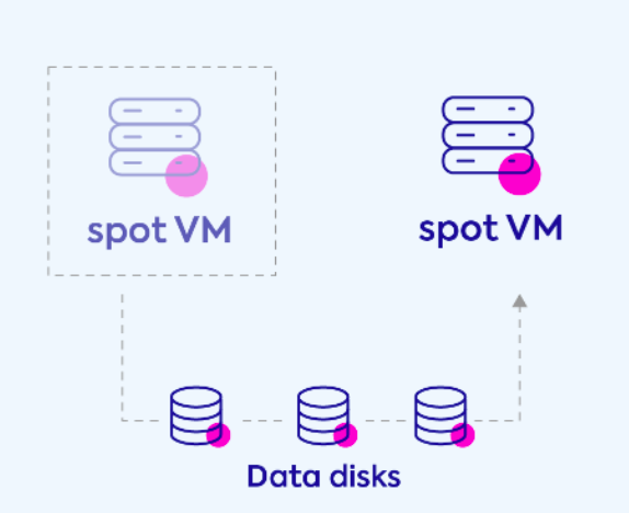 The same disk is detached from the original VM and reattached to the newly launched VM. If the new VM is launched in a different availability zone (AZ), Spot creates a new disk from the latest snapshot and attaches it to the new VM (as disks cannot be migrated between AZs). Spot maintains the same disks as long as the VM is launched in the same AZ.