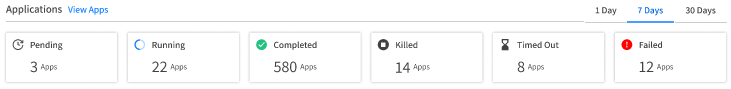 The Applications line gives you a quick rundown of the status of your Spark applications on the cluster. Each tile shows the number of applications in each status during the selected time period. The following statuses are shown: