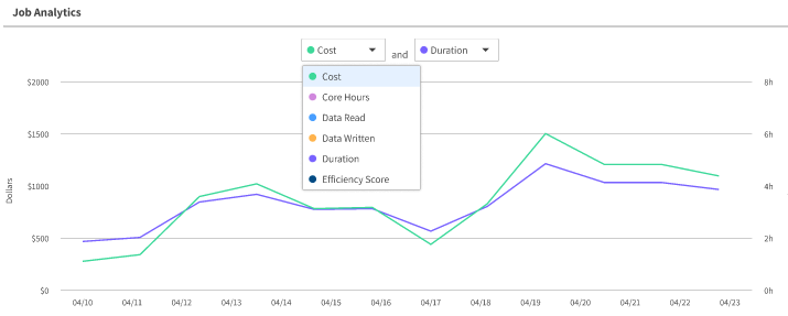 In the Job Analytics graph, you can choose two metrics to plot on the same graph, as shown in the example below, so that it is easy to see the trends and correlations between two metrics.